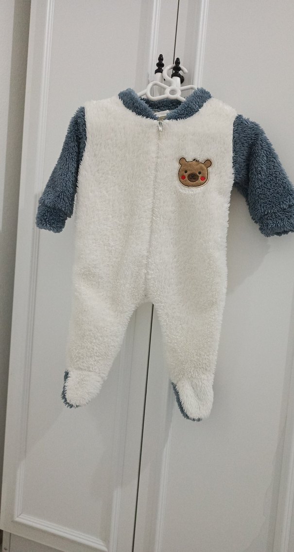 Yumuşak ve sıcak kumaş, kürk detaylar, renkli nakışlar ve kapüşonlu ayaklı tasarıma sahip erkek bebek tulumu.