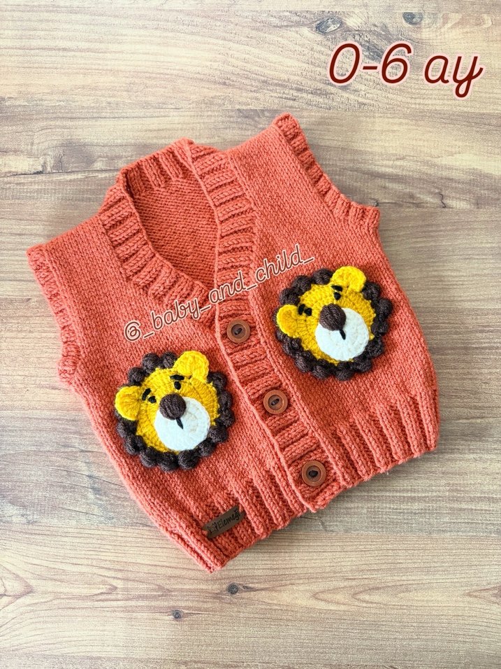 Renkli nakışlı aslan detaylı, kahverengi, kolsuz, bol kesim erkek bebek triko yelek. 0-6 ay arası için uygun, rahat streetwear tarzı.