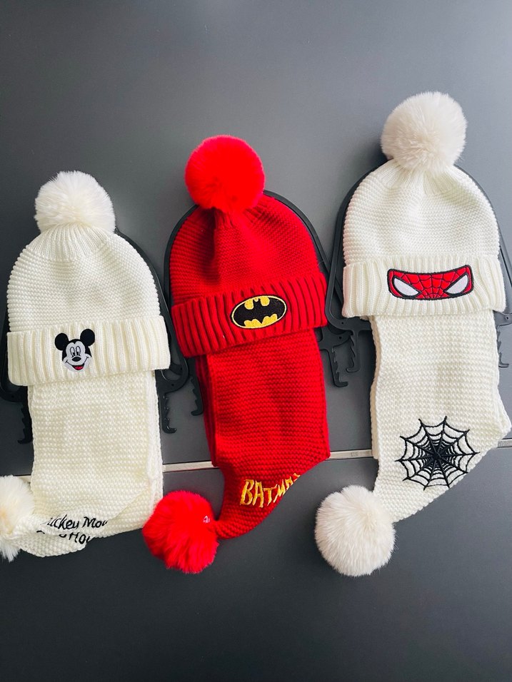 Renkli nakışlı pop kültür desenlerine sahip örme erkek çocuk bere ve atkı setleri. Yumuşak örme kumaş ve ponponlar, rock punk havası katıyor.