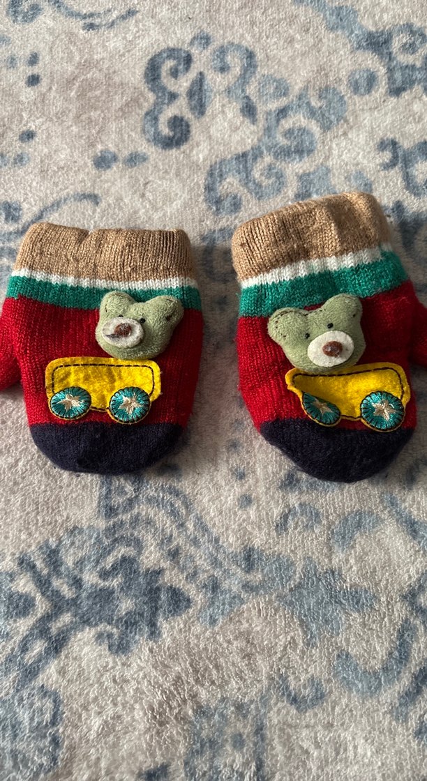 Yumuşak ve sıcak kumaştan örülmüş, renkli çizgili ve nakışlı ayıcık ile araba desenli erkek çocuk eldiveni .