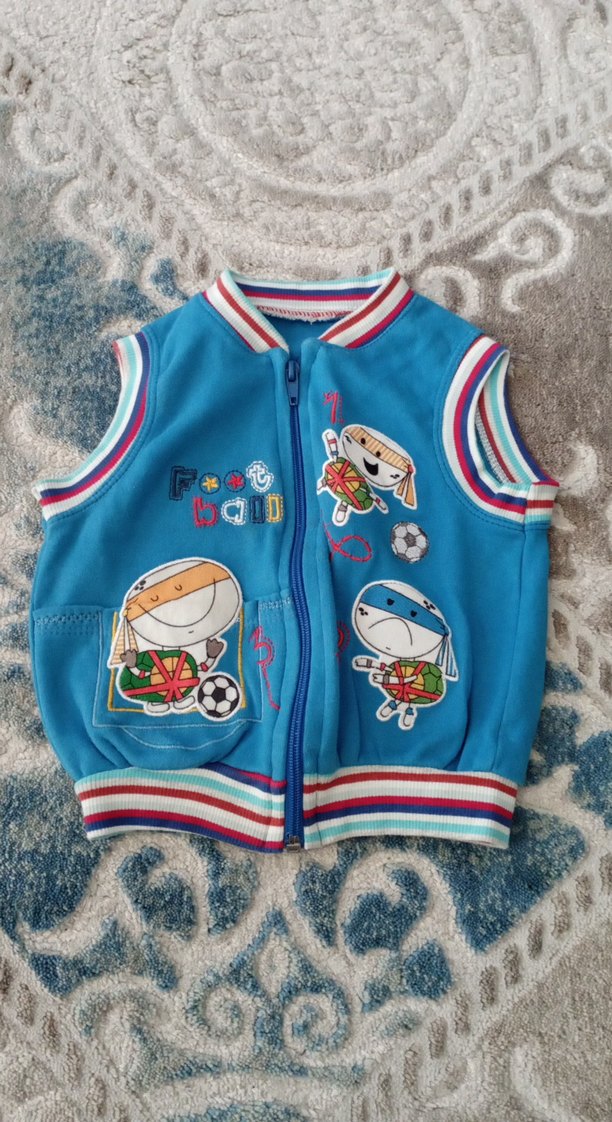 Mavi renkli, fermuarlı, nakışlı ve kolsuz erkek çocuk yeleği. Yumuşak ve sıcak kumaştan, trend sokak stili için uygundur. ⚽