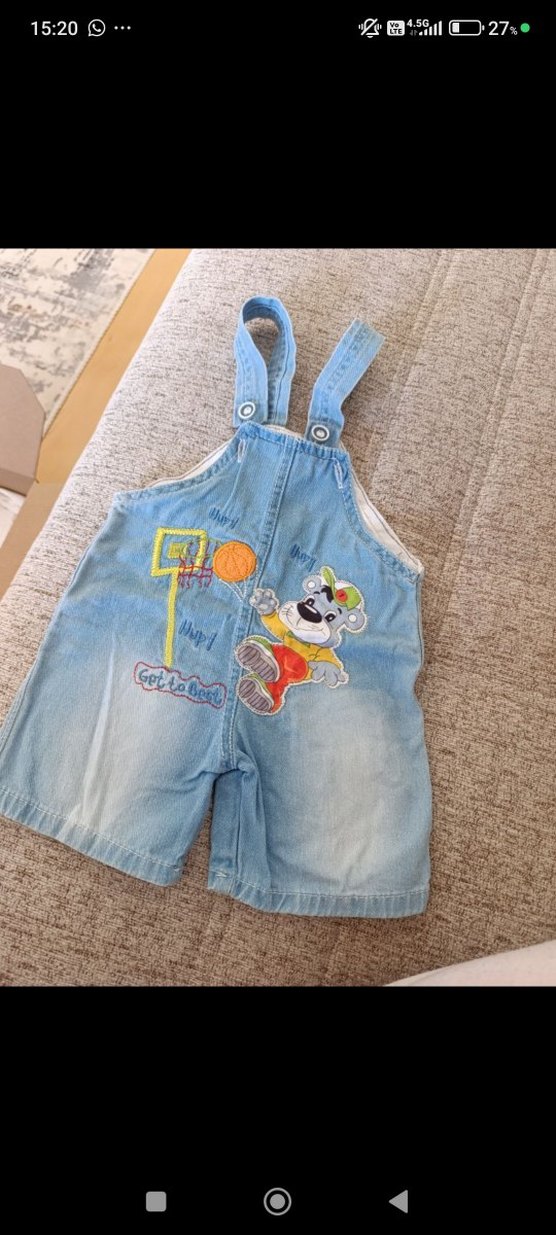 Renkli nakışlı ve düğmeli askılı, bol kesim erkek çocuk kot şort tulumu. 6-9 aylık az kullanıldı deformesi yoktur