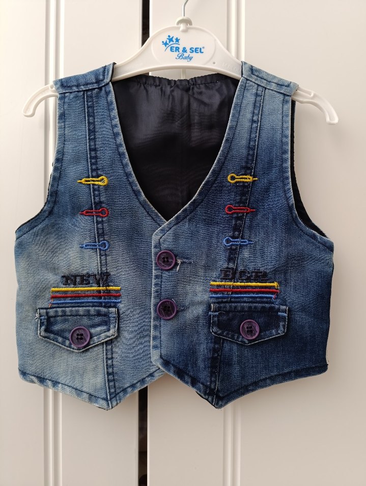 Renkli nakış detaylı, düğmeli, kot kumaştan erkek çocuk yeleği. Kolsuz, kesimli yaka ve cep detaylarına sahiptir, sokak stiline uygun şık tasarım.