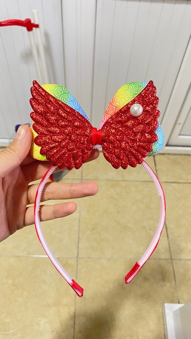 Çocuklar için renkli nakışlı desenlere sahip, kırmızı simli kanatlı ve inci detaylı fiyonklu taç. Bohem ve retro tarzda.