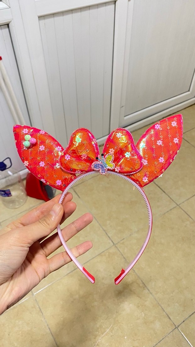 Renkli nakışlı kumaştan yapılmış, büyük fiyonk ve süslemelerle detaylandırılmış çocuk taçı.