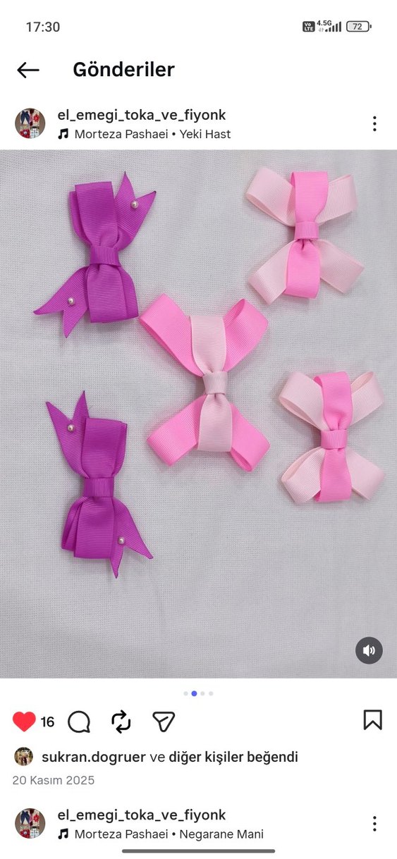 Pembe ve mor tonlarında, nakışlı fiyonk detaylı renkli saç tokaları. Küçük inci süslemeleri ve çağdaş tasarımıyla öne çıkar. çift fiyat li bu