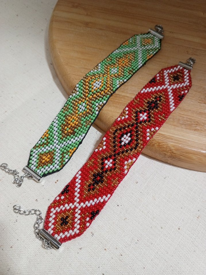 Nakışlı desenlere sahip renkli boncuklu, geleneksel tarzda kadın bileklikleri, günlük kullanım için uygundur.