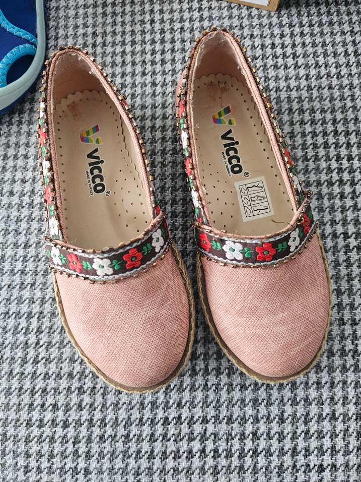 Renkli nakış detaylı, velcro bantlı, dolgu topuklu pembe kadın espadril. Kauçuk tabanlı, günlük kullanıma uygun.