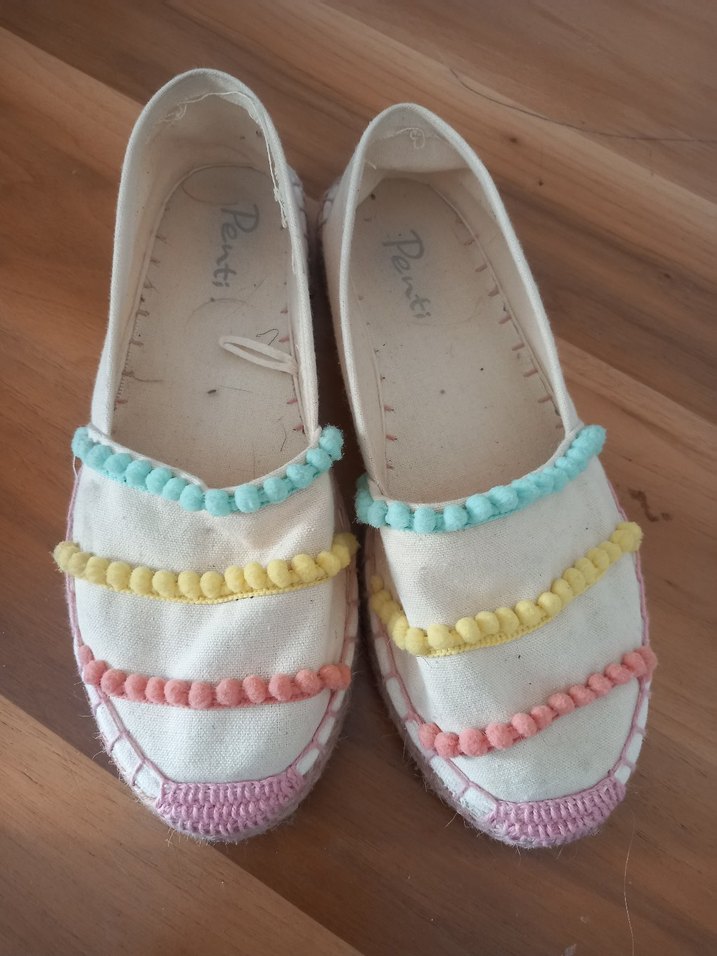 Kadın espadriller, yumuşak pamuk kumaştan Renkli nakışlı ve pastel ponpon detaylı, bohem günlük tarz için uygundur. Sorunsuz iki kez kısa süre kullanıldı