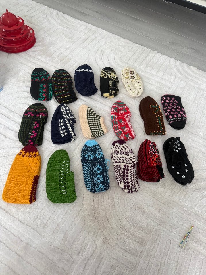Renkli nakışlı, düz tabanlı kadın triko ev patikleri. Kullanışlı işlemeleri orijinal el işlemesi ve günlük kullanım için çok rahat, düz modelleri de var.
