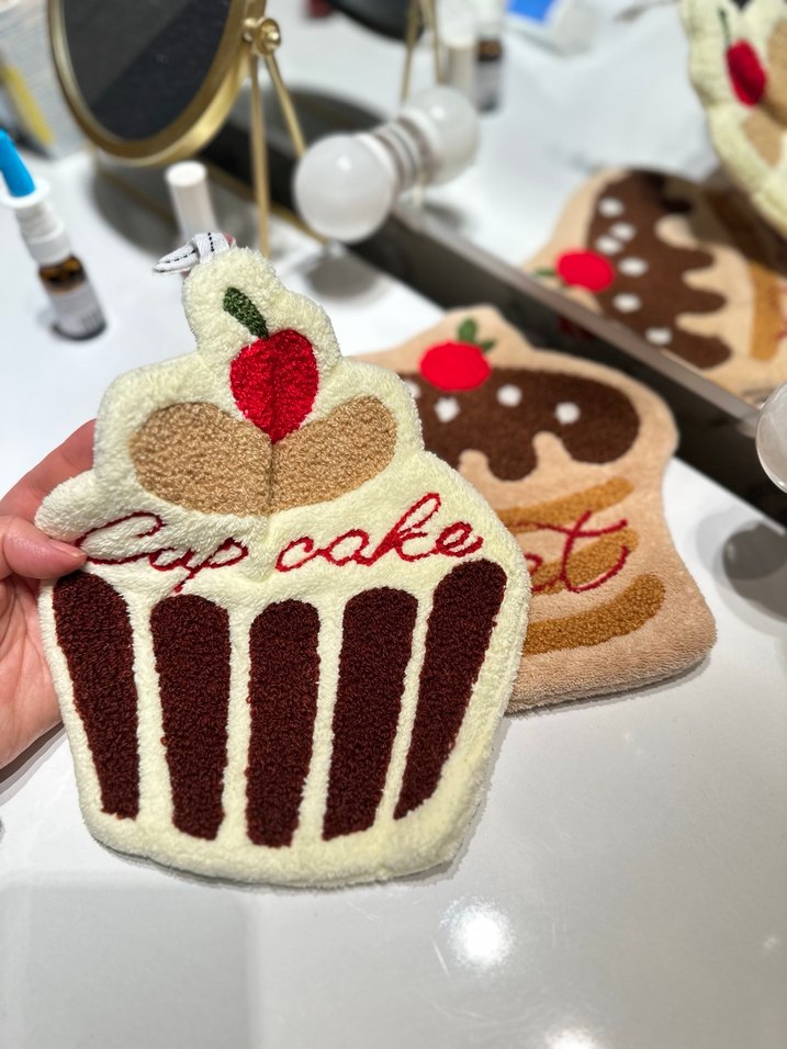 Kahverengi fırın eldiveni, renkli nakışlı cupcake desenleri ve "cupcake" yazısıyla mutfakta kullanıma uygun.