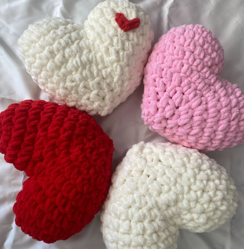 Yumuşak, kalın örgü kumaştan yapılmış, renkli nakışlı kalp şeklinde yastıklar. Beyaz, pembe ve kırmızı renk seçenekleriyle. ❤️