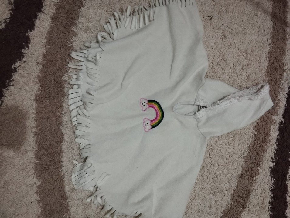 Renkli nakışlı gökkuşağı ve fırfırlı beyaz kız pançosu. Kapüşonlu, bol kesim ve uzun kolludur, bohem tarzda.