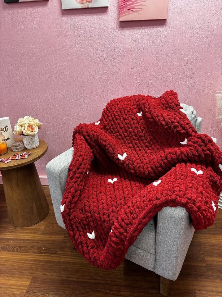 Yumuşak, kalın örgü dokulu renkli nakışlı kırmızı battaniye, rahatlamak için ideal. ️