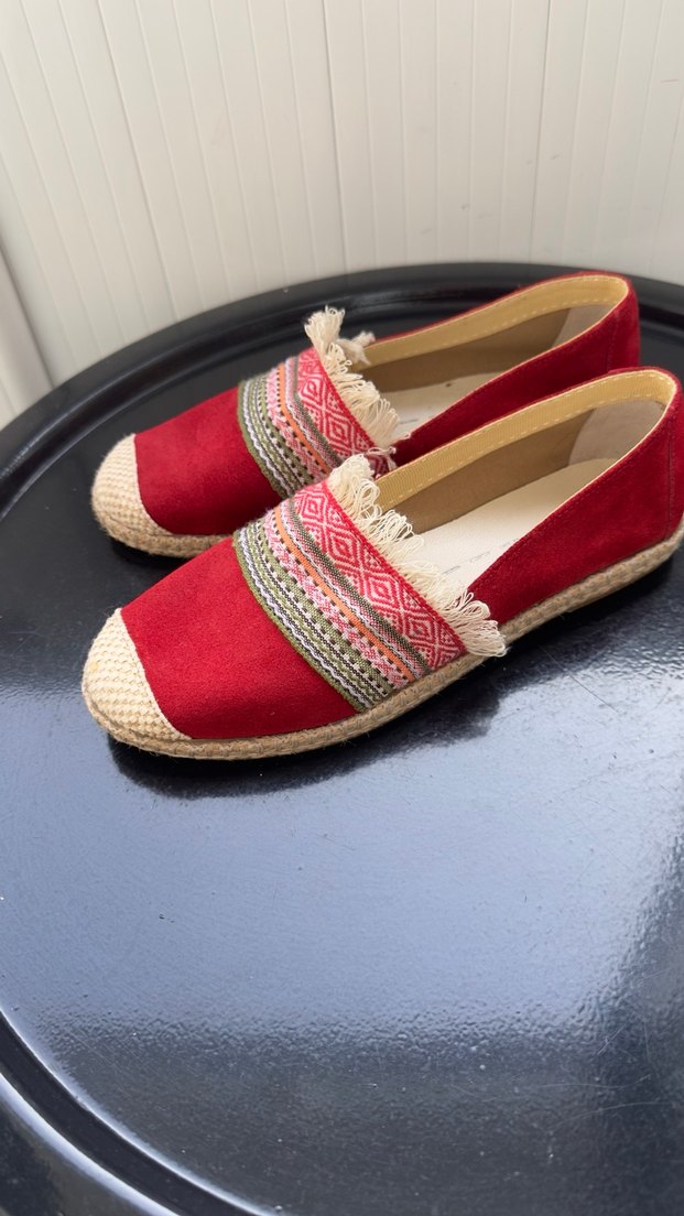 Bu kırmızı espadriller, dolgu topuk ve renkli nakışlı desenlere, püskül detaylarına sahip sentetik kumaştan yapılmıştır. Günlük kullanım için uygundur.