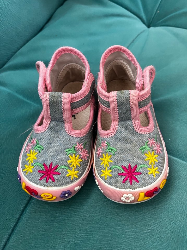 Renkli nakışlı, lastik tabanlı ve cırt cırtlı kız bebek ayakkabısı. Bohem, retro tarzda çiçek desenleriyle süslenmiştir. 23 numara