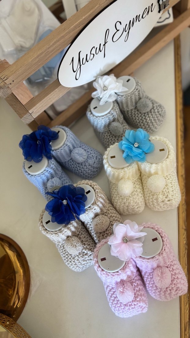 Renkli nakışlı detaylara sahip örgü kız bebek patikleri, sade ve bohem tarzda, yumuşak örme kumaştan üretilmiştir.