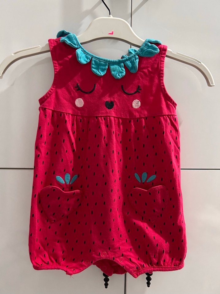 Canlı kırmızı renkte, nakış detaylı ve yakasında fırfır süslemeleri bulunan renkli kız bebek tulumu.