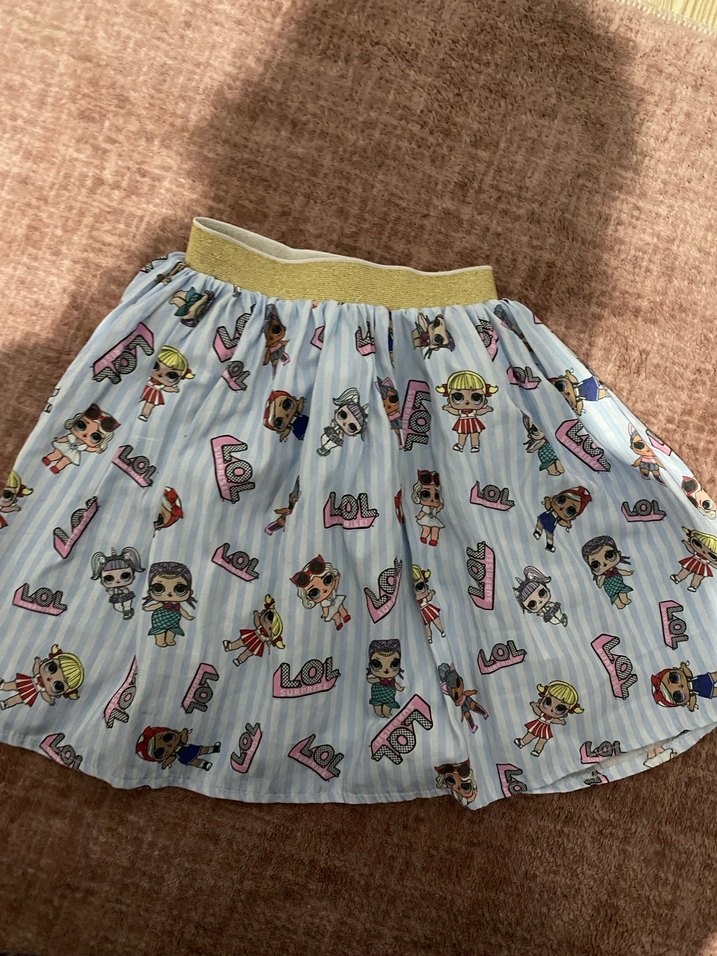 Sentetik kumaştan, nakışlı pop kültür figürleriyle renkli, bol kesim ve fırfırlı kız çocuk eteği.