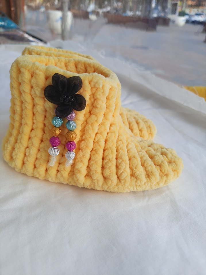 Sarı renkli, nakışlı detaylara sahip kız çocukları için örgü ev terliği. Yumuşak örgü kumaş sıcaklık ve rahatlık sağlar.