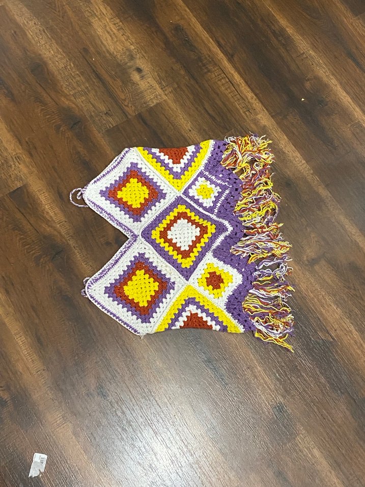 Renkli nakışlı, örgü kız çocuk pançosu. Kapüşonlu yakası ve askılı kollarıyla bol kesim bohem tarzına uygundur.