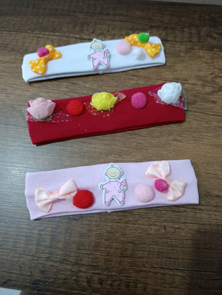 Renkli nakışlı, kurdele detaylı kız çocuk saç bantları. Yumuşak süslemelerle sade ve şık tasarım.3 adettir