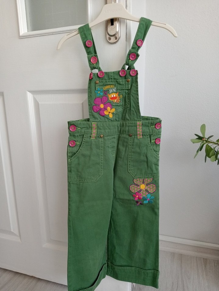 Renkli nakış detaylı, düğmeli askılı, bol kesim yeşil kız çocuk salopet