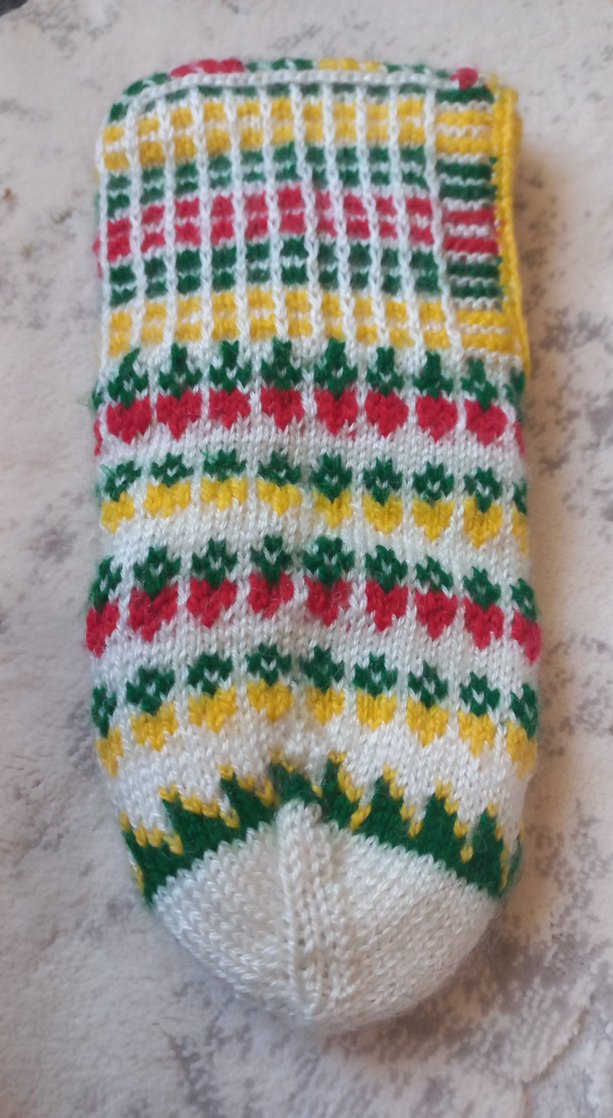 Beyaz taban üzerine kırmızı, sarı ve yeşil nakışlı renkli kız çorabı. Yumuşak ve rahat örme