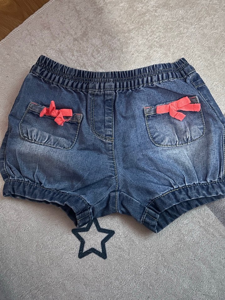 Mavi kot kumaştan, loose fit kesime sahip, nakış detaylı ve arka ceplerinde pembe fiyonk süslemeleri bulunan kız çocuk şortu. Rahat ve günlük tarz için uygun.