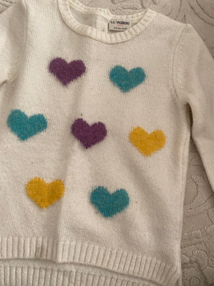 Rahat kesim, uzun kollu ve yuvarlak yakalı kız triko kazak. Yumuşak örgü kumaştan, pastel tonlarda renkli nakışlı kalplerle süslenmiş, bohem ve retro tarzda.