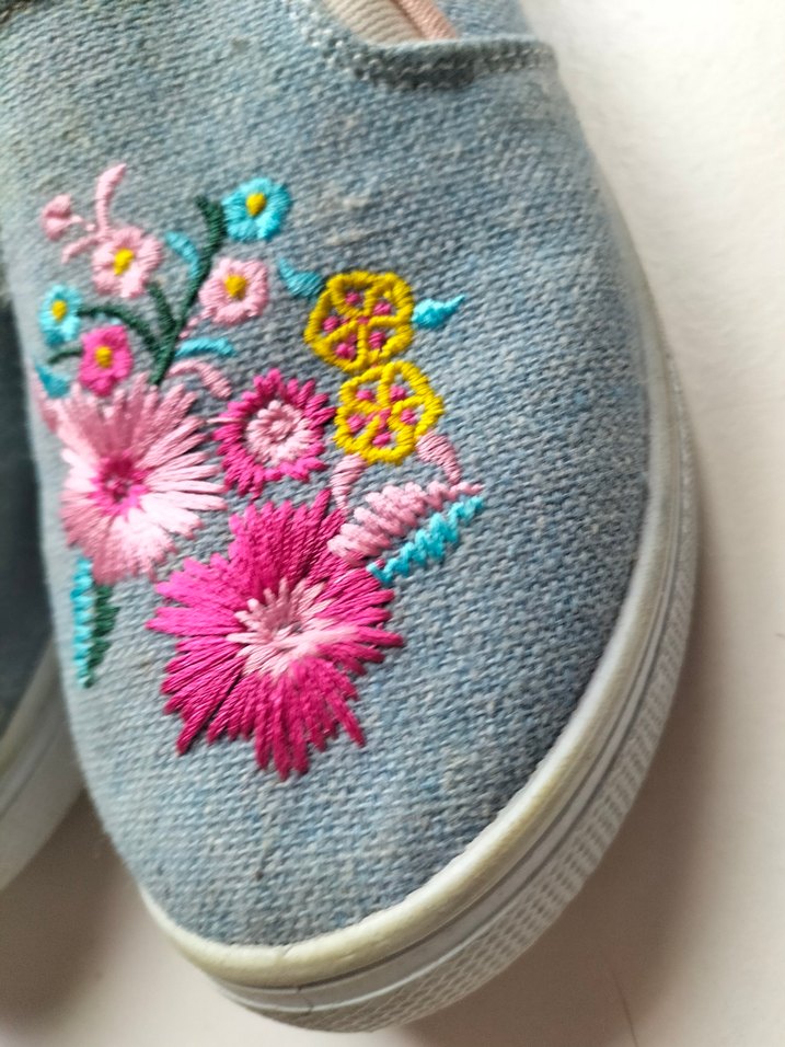 Kot kumaştan, renkli çiçek nakışlı ve düğmeli, kama topuklu bohem tarzda sneakers.
