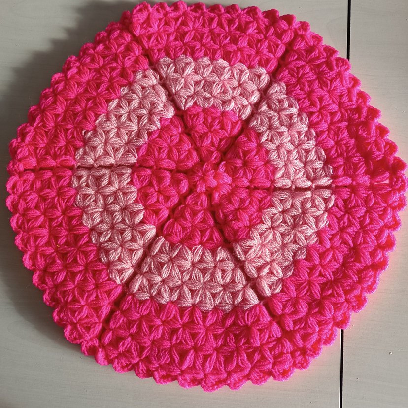 Pembe tonlarında nakışlı desenlere sahip renkli lif yumuşak ve rahat bir doku sunar.