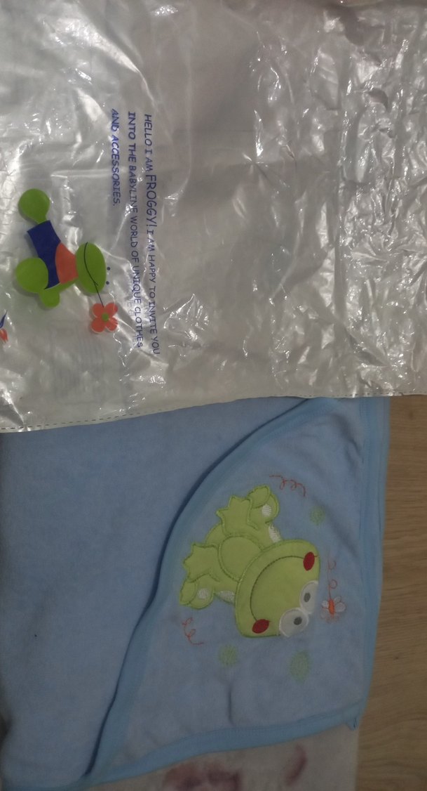 Yumuşak ve sıcak mavi kumaş üzerinde nakışlı kurbağa desenleri bulunan renkli çocuk havlusu Ambalajda yazılı metinler yer alır.
