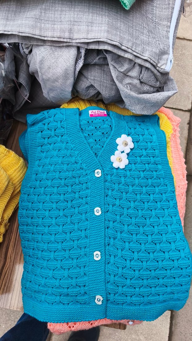 Renkli nakışlı, düğmeli ve gevşek kesim mavi kız çocuk triko yelektir. Sokak stiline uygundur ve çiçek detayları bulunur.