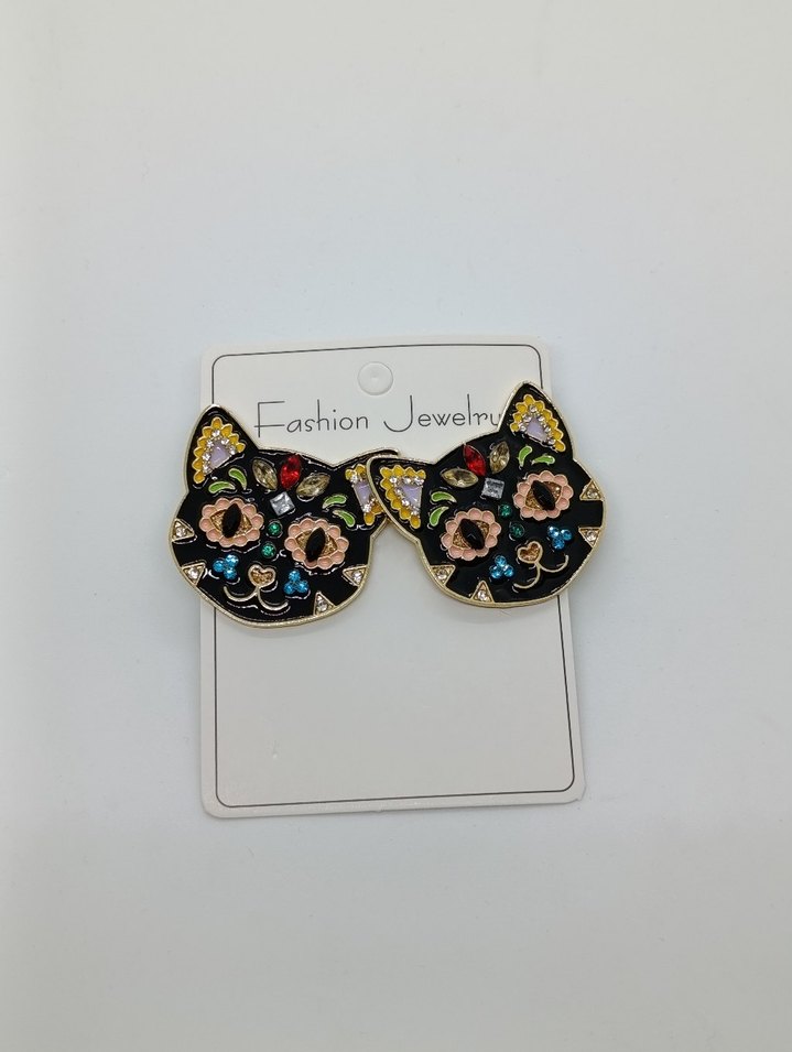 Renkli nakışlı ve payet detaylı kısa uzunlukta, bohem tarzda kedi figürlü mini küpe. Günlük kullanıma uygun, retro Paris tarzı.