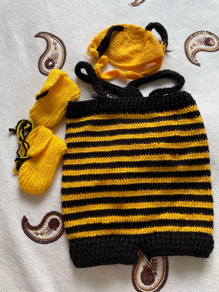 Satıldı. Renkli çizgili, askılı örgü tulum, uyumlu şapka ve patiklerden oluşan nakışlı bebek kız takımı. Kızına aylık fotoğraf çekimi için kullandım arı maya kostümü el örgüsüdür marka temsili