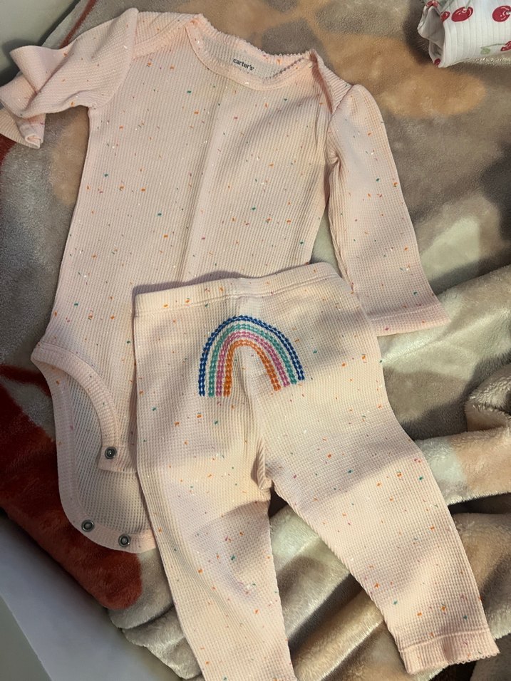 Pastel renklerde, uzun kollu örgü bebek kız takımı, pantolon üzerinde gökkuşağı nakışı ile tamamlanmıştır. Yumuşak dokusu rahatlık sağlar.