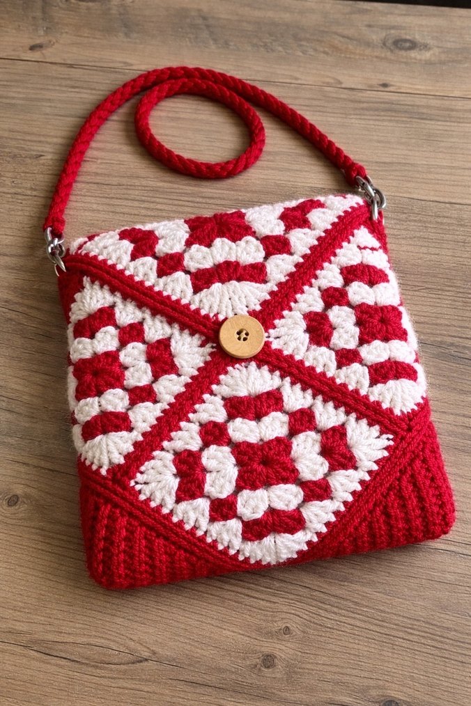 Renkli nakışlı örgü kadın çanta, ahşap düğmeli ve örgü saplı, bohem tarzıyla günlük kullanım için uygundur.