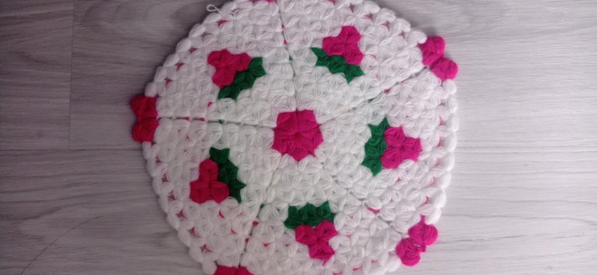 Beyaz zemin üzerine pembe ve yeşil nakışlı çiçek desenleri bulunan renkli örgü çeyizlik lif yumuşak ve rahat bir doku sunar.