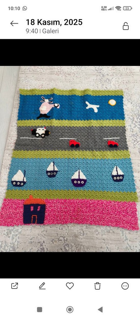 Renkli örgü çocuk battaniyesi, nakışlı tekne, araba ve hayvan desenleriyle neşeli bir görünüm sunar.