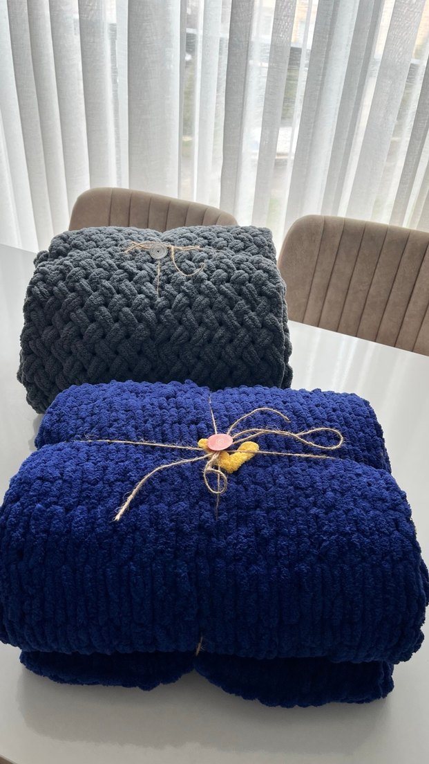 Gri ve mavi tonlarda renkli nakışlı örgü çocuk battaniyesi, yumuşak ve rahat dokusu ile konfor sağlar.
