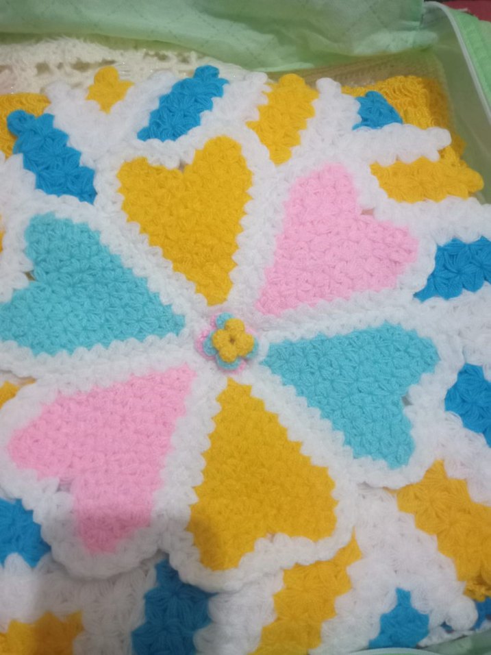 Mavi, sarı ve pembe kalp desenli, beyaz zemin üzerine nakışlı renkli örgü çocuk battaniyesi. Yumuşak ve konforlu.