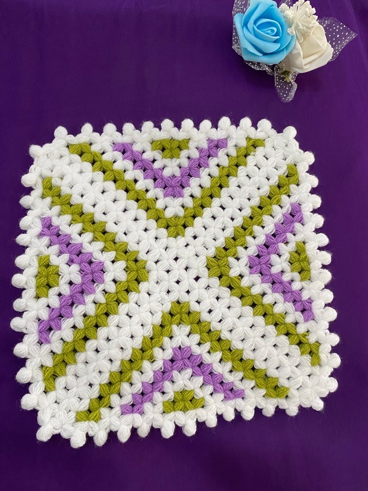 Yumuşak örgüden yapılmış, beyaz, yeşil ve mor tonlarında renkli nakışlı çocuk battaniyesi. ❤️ Adet fiyatı 250₺
