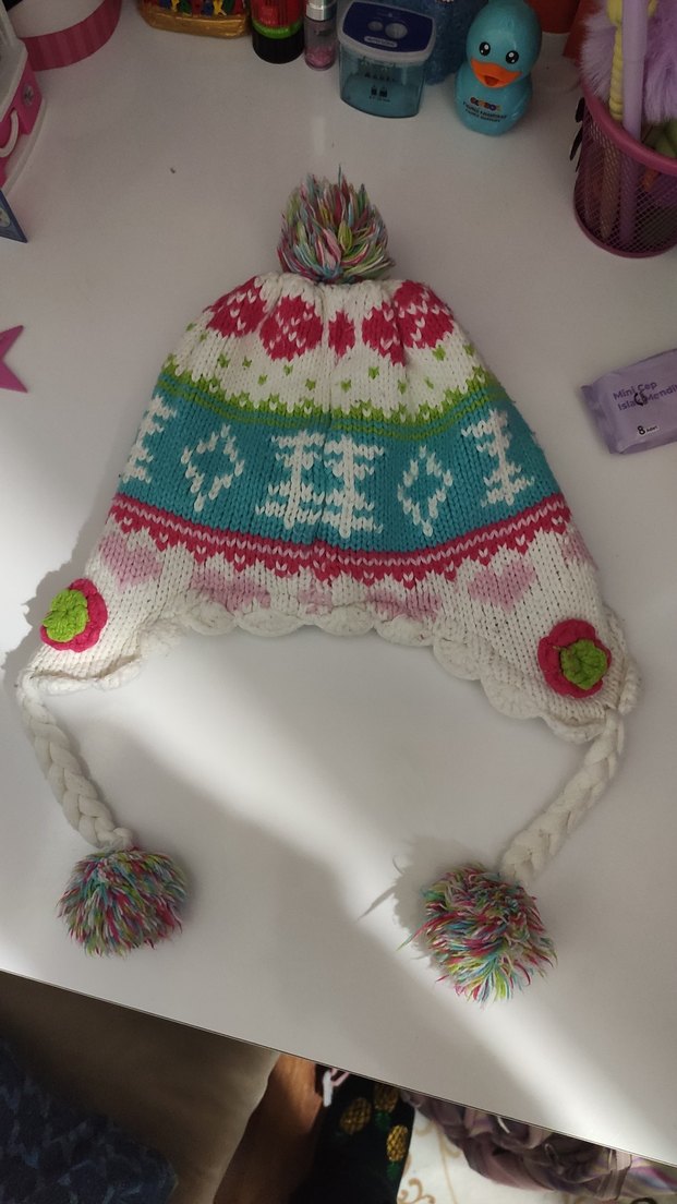 Nakışlı desenli, örgü renkli çocuk bere. Örgü püsküller ve ponponlar ile süslenmiştir.
