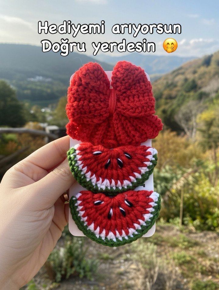 Örgü, renkli ve nakışlı karpuz desenli çocuk saç tokaları seti. Kırmızı fiyonk ve iki karpuz dilimi tokası içerir.