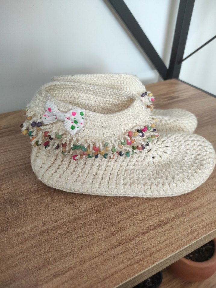 Renkli nakış detaylı beyaz örgü çocuk terlikler, konforlu ve bohem tarzı günlük kullanıma sunar.