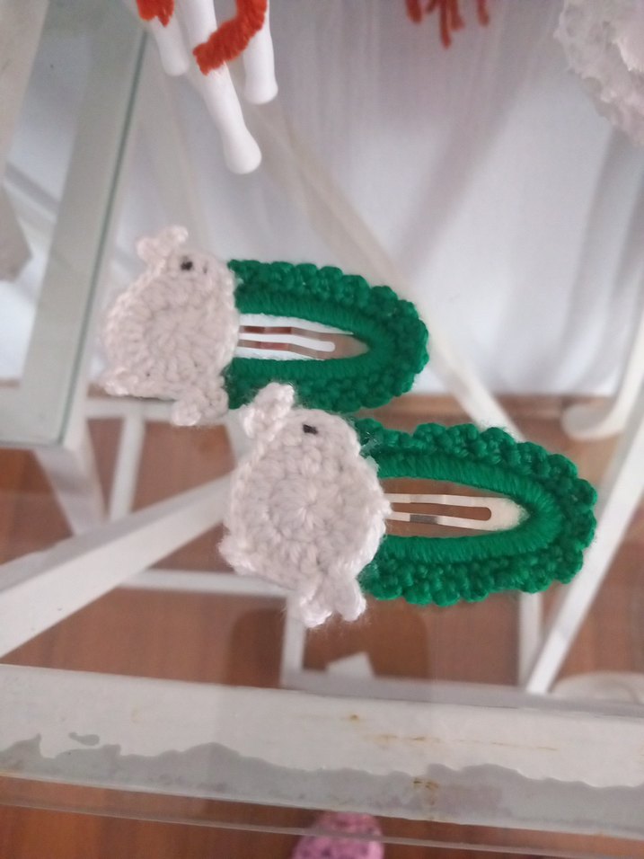Renkli nakışlı, beyaz örgü tavşan figürlü, yeşil tabanlı bohem tarzda çocuk tokası.
