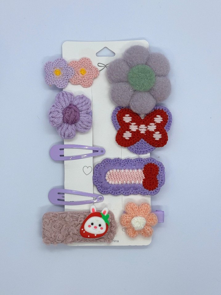 Çiçek, kelebek ve çilek nakışlı renkli örgü çocuk tokaları ve bantları seti.