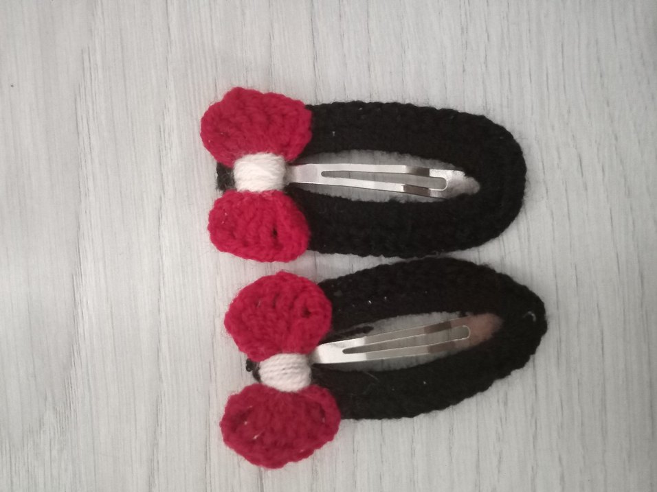 Örgü siyah saç tokaları, kırmızı ve beyaz renkli nakışlı fiyonklarla süslenmiştir. Goth tarzında, sade ve temel görünümlü çocuk aksesuarlarıdır.