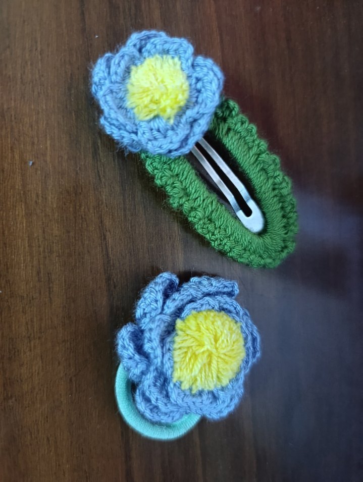 Nakışlı çiçek desenli, renkli örgü çocuk saç tokası seti. çıt çıt yaklaşık 6 cm boyutunda, diğeri lastikli toka